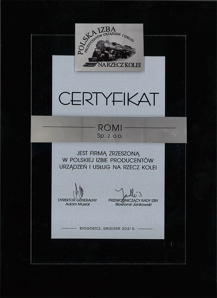W dniach 6-7 grudnia 2021 mieliśmy przyjemność wziąć udział w III Konferencji Bezpieczeństwa Na Kolei oraz zaprezentować ofertę firmy Romi. Podczas konferencji na ręce Mikołaja Olszewskiego (Członek Zarządu) został uroczyście przekazany certyfikat przynależności Romi do Polskiej Izby Producentów Urządzeń i Usług na Rzecz Kolei.