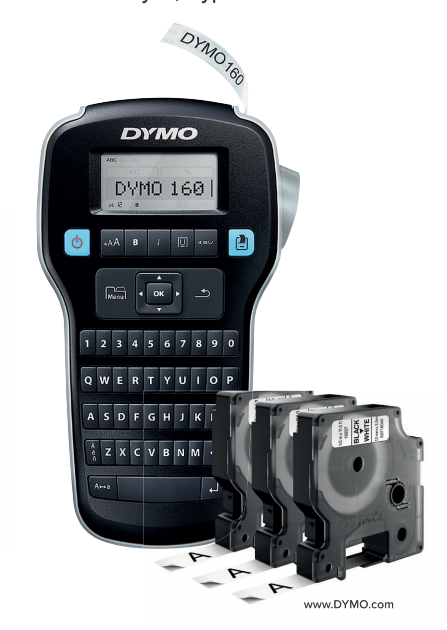 Drukarka etykiet LabelManager 160 to model podstawowy drukarek dymo przenośnych z łatwymi w użyciu inteligentnymi klawiszami. Inteligentne klawisze zapewniają proste formatowanie etykiet jednym naciśnięciem przycisku. Twórz wspaniałe etykiety w dowolnym miejscu i zmniejsz liczbę naciskanych klawiszy.