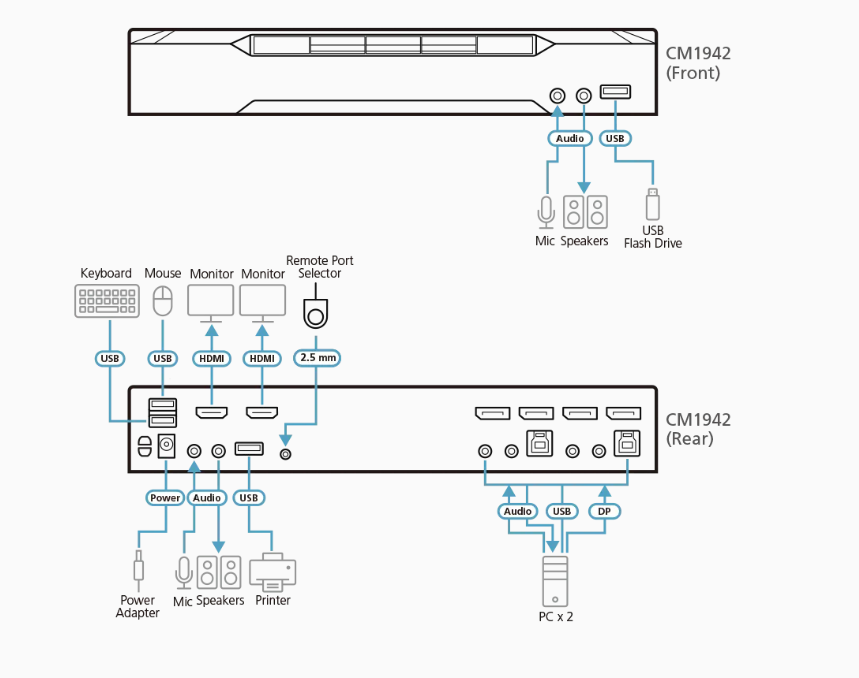 Zaawansowana obsługa wideo zapewnia lepiej zdefiniowane połączenie HDMI z obrazami o wyrazistej rozdzielczości do 4K DCI (4096 x 2160 @ 60 Hz). Dzięki CM1942 użytkownicy mogą szybko i bez wysiłku przełączać się między dwoma komputerami za pomocą wygodnych przycisków, klawiszy skrótu, kółka myszy, kursora myszy i zdalnego selektora portu. Dzięki funkcji Boundless Switching, CM1942 pozwala użytkownikom po prostu przesuwać kursor myszy pomiędzy oknami, aby przełączać się na inne źródła wideo. Ułatwia to natychmiastowy dostęp i kontrolę nad komputerem docelowym. Wbudowany 2-portowy koncentrator USB 3.1 Gen 1 ułatwia dostęp do podłączonych urządzeń peryferyjnych między dwoma komputerami, a przełączanie urządzeń peryferyjnych odbywa się niezależnie od fokusa KVM. Ponadto urządzenie CM1942 zapewnia transfer danych z szybkością do 5 Gb/s, co przekłada się na maksymalną wydajność pracy z multimediami.