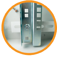 System uszczelek znajdujący się na dachu szafy, w jej drzwiach oraz wpustach kablowych, chroni zawartość przed kurzem i wilgocią. Wewnątrz szafy znajdują się dwie szyny montażowe odpowiednie do instalacji 19” podzespołów. Całość zabezpieczona została hartowanym 3-punktowym zamkiem.